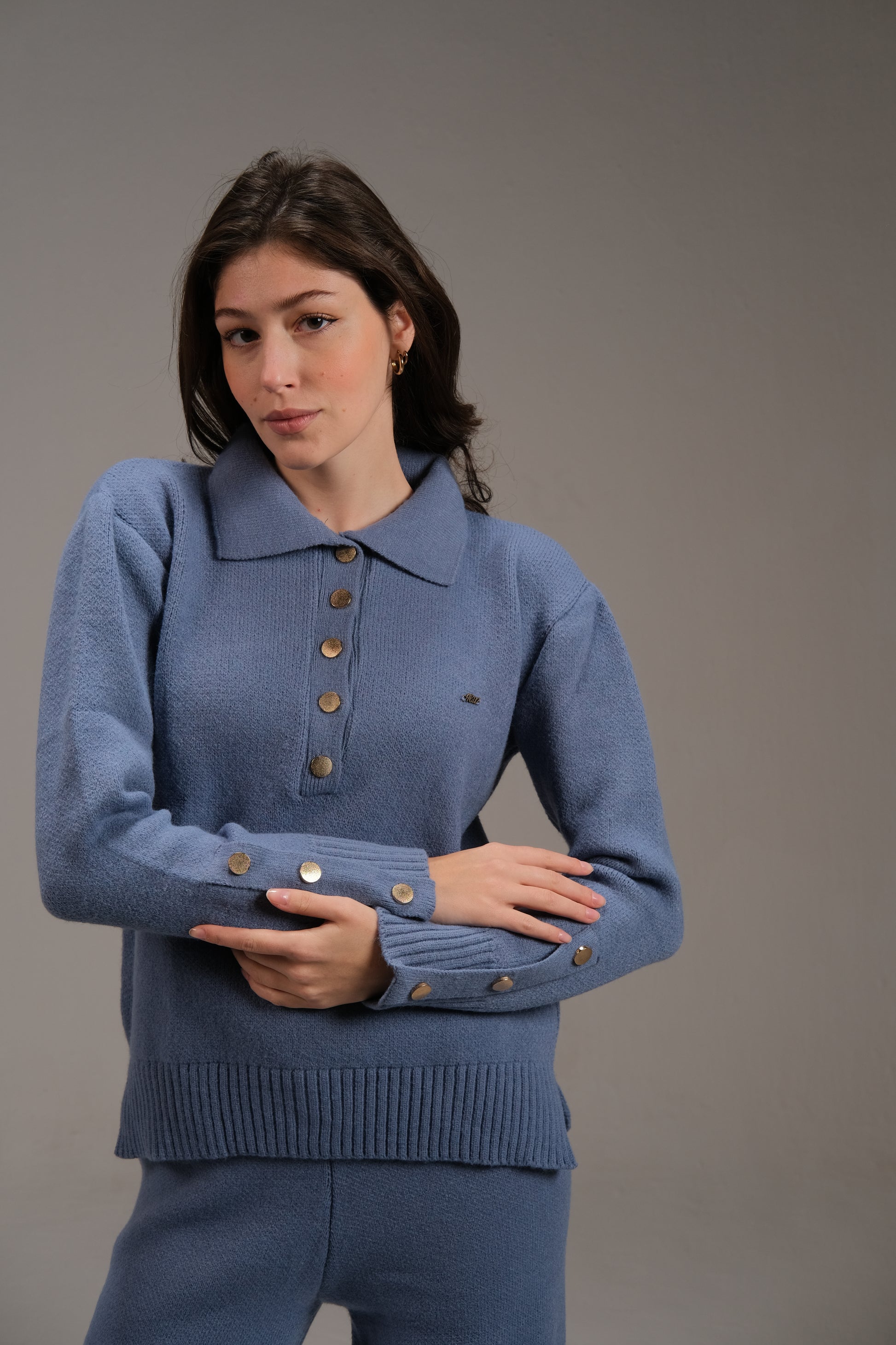 بلوزة قطنية محبوكة بأزرار باللون الأزرق